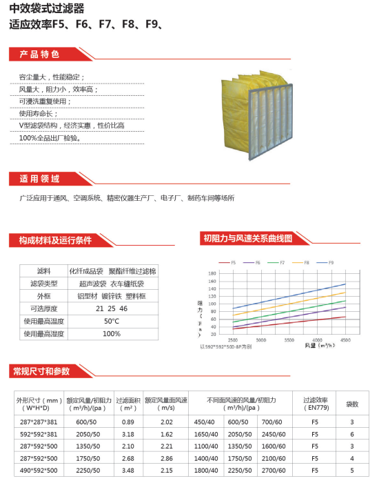 結(jié)構(gòu)緊湊,輕便 中效袋式過(guò)濾器的框架可選用鍍鋅鋼、鋁合金,再輔以濾袋支撐鐵骨架,既有效支撐了濾袋,又可最大限度的增加過(guò)濾面積,整體緊湊,堅(jiān)固,易于安裝、拆卸。 優(yōu)質(zhì)的多層聚酯濾料,高容塵,低阻力 采用優(yōu)質(zhì)蓬松的多層聚酯合成纖維,其進(jìn)風(fēng)面蓬松, 出風(fēng)面緊實(shí),在保證效率的同時(shí),提供了較大的容塵量。 合理的設(shè)置了濾袋數(shù)量,增加了過(guò)濾面積及容塵量,同時(shí)降低了阻力。